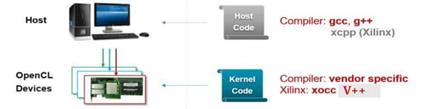Figure 2: The diagram shows how the Open CL structure enables a host program to use a standard compiler while the kernel uses a vendor-specific compiler. (Source: Xilinx)