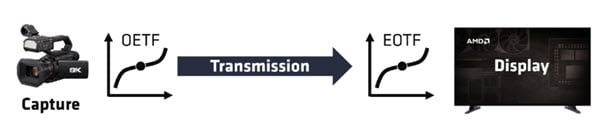 Figure 1 shows the concept of a high level HDR system. In the beginning of the HDR process, captured scene light is converted to an electrical representation using an opto-electronic transfer function (OETF). Sensors and cameras capture a fair amount of scene light , which is often managed in post-production, where further processing can optimize color and light levels. That electrical representation is distributed to one or more displays, where it's converted back into scene light using an electro-optical transfer function (EOFT). The original EOFT designed for CRTs (cathode ray tubes) is known as gamma.
